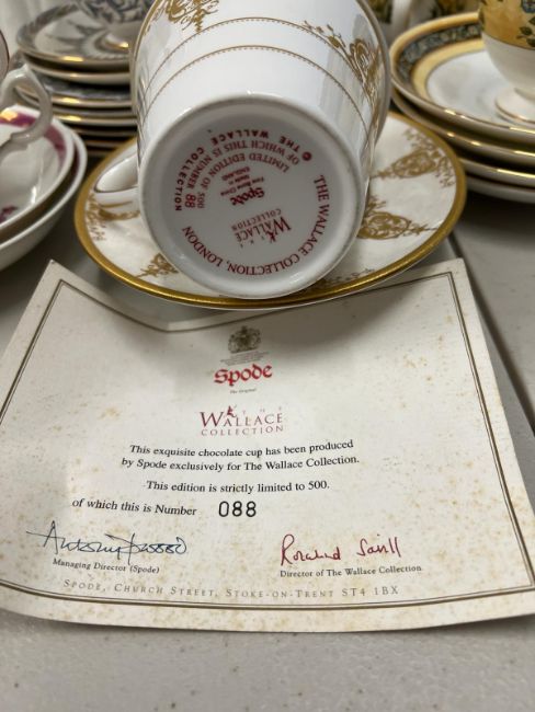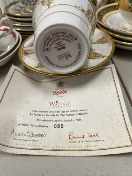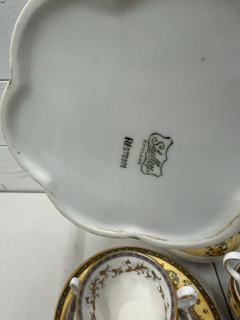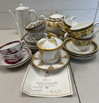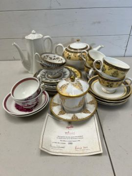 A mixed selection of china tea cups and teapots, various makers