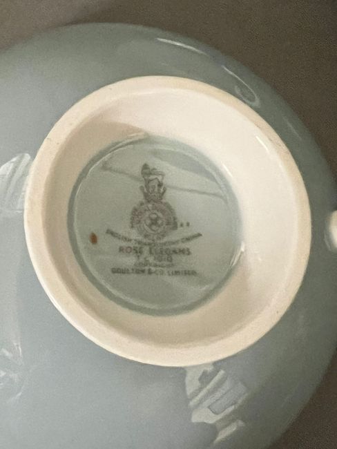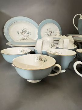 Royal Doulton dinner service" Rose Elegance" to include 14 Dinner plates, 13 Medium plates, 18 Side plates, 4 Vegetable dishes and lids, 6 coffee cups, 6 coffee saucers, 6 tea cups (1 chipped cup), 6 tea saucers, 2 oval serving plates, cake plate, Coffee pot, cream jug, milk jug, 2 Soup bowls with handles,2 medium sugar bowls, 1 small sugar bowl, 1 egg cup, 3 gravy boats and saucers and 10 cereal bowls