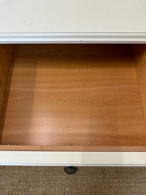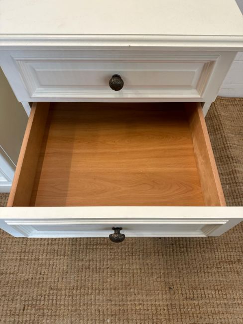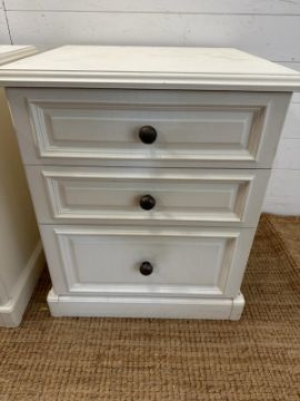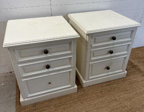 A pair of white painted three drawer bedside tables