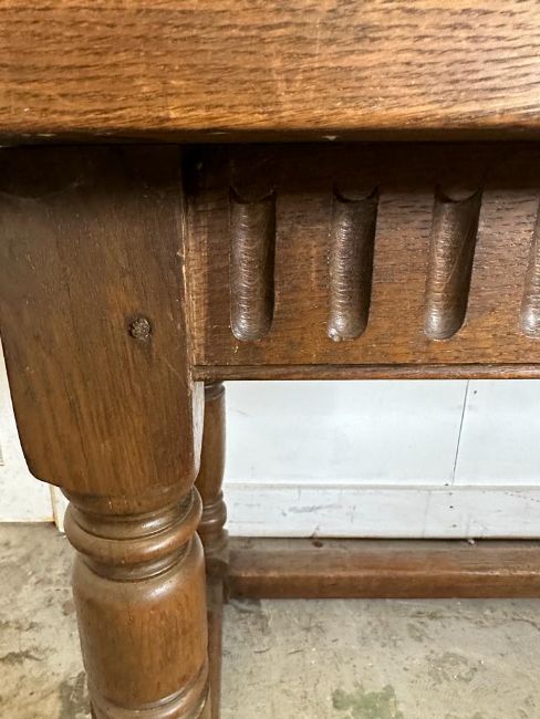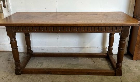 An oak hall table with carved front, on turned legs and block feet (H75cm W169cm x d68cm)