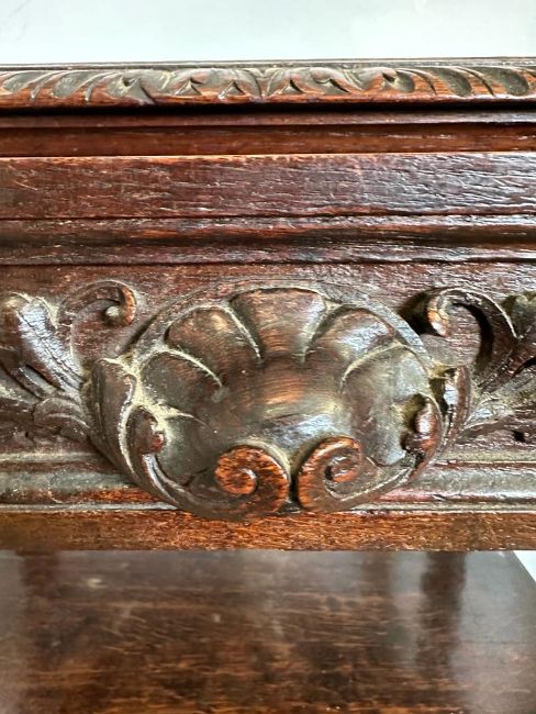 An oak late Victorian buffet, two shelves on barley twist support with a single carved fronted drawer (H101cm W76cm D46cm)