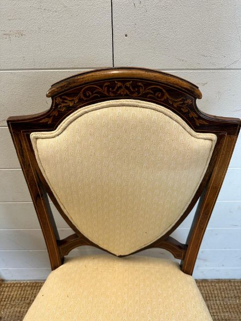 Six Edwardian shield back and inlaid hall chairs upholstered in white