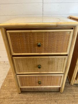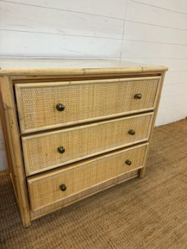 A three drawer bamboo and cane chest of drawers and a matching smaller three drawer chest (H72cm W79cm D48cm)