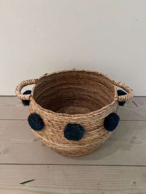 A wove rush basket with pom poms (H32cm W59cm)