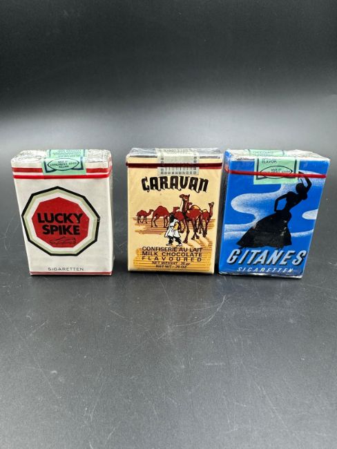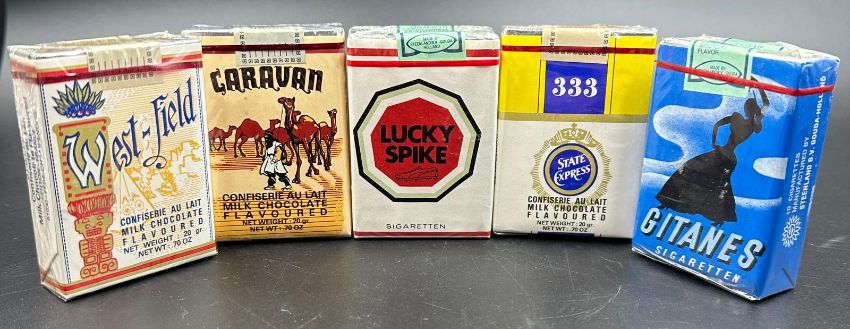 Five vintage packets of cigarettes to include Lucky Spike, West Field, Caravan, Gitanes and 333