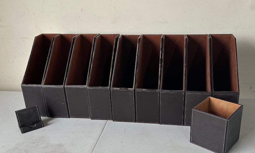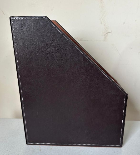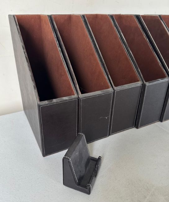 A selection of brown faux leather desk top document holders along with a matching storage pot on stand