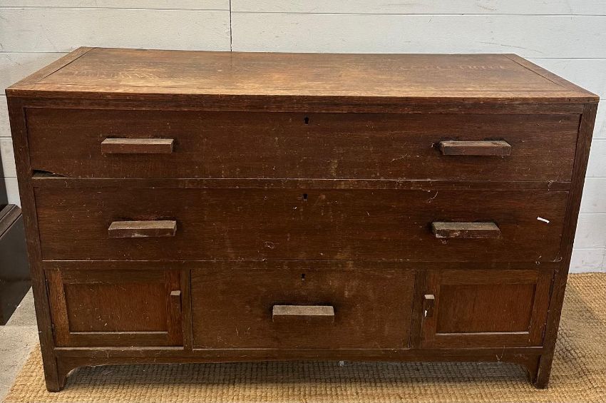 An oak sideboard with two long drawers over one central drawer flanked by two cupboards AF (H74cm W121cm D45cm)