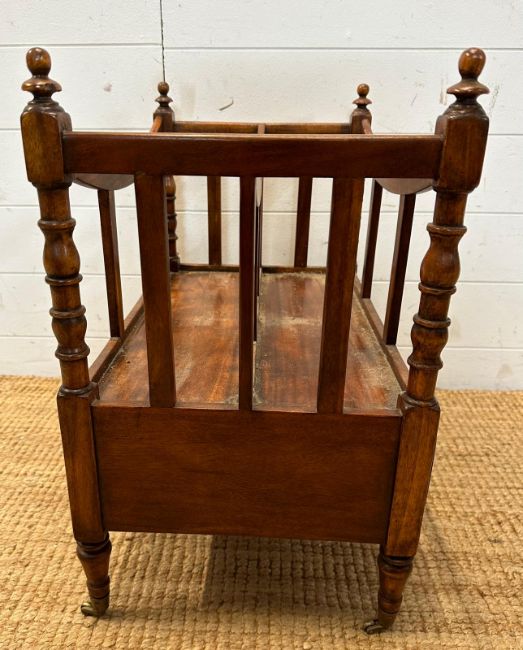 A mahogany single drawer canterbury on turned supports and castors with turned finials to top