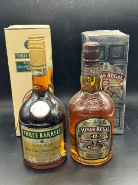 A bottle of three Barrels Brandy and a bottle of Chivas Regal whisky, both boxed