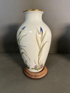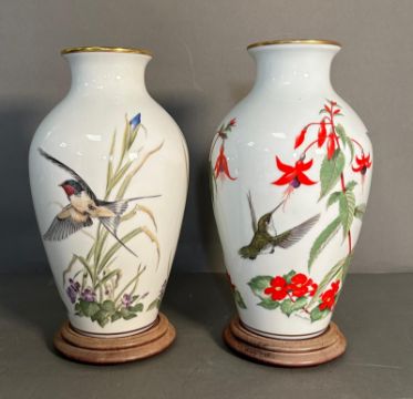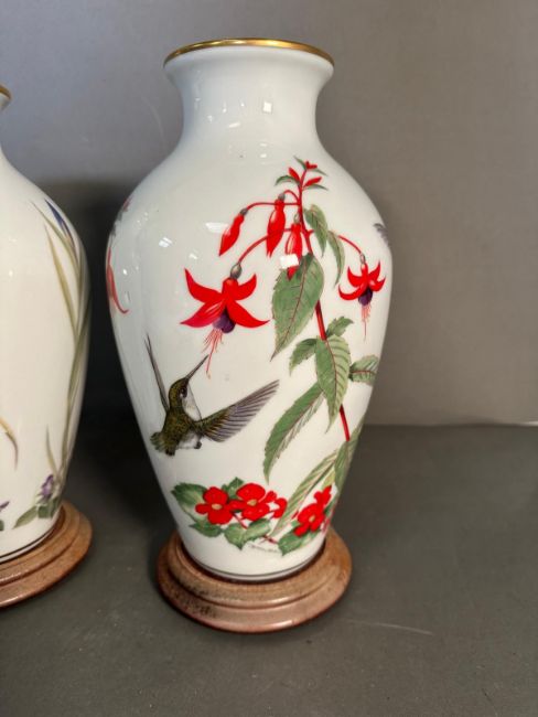 Two Franklin porcelain vases on plinths "The Meadowland Bird vase" and "The Garden Bird Vase" AF