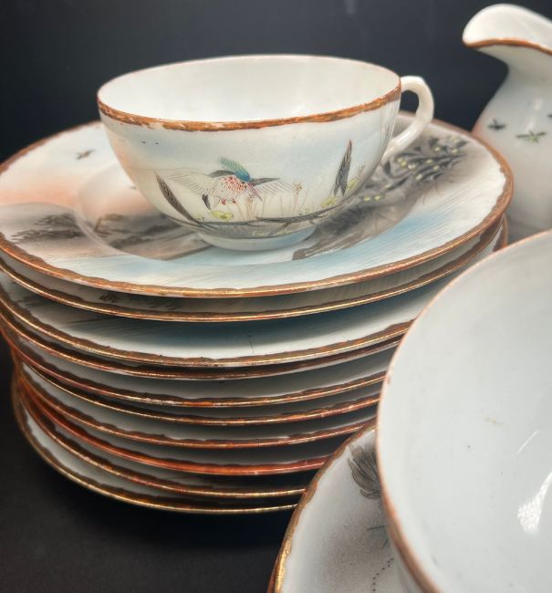 two cups have hairline and chips, three small plates has chips and hairline cracks