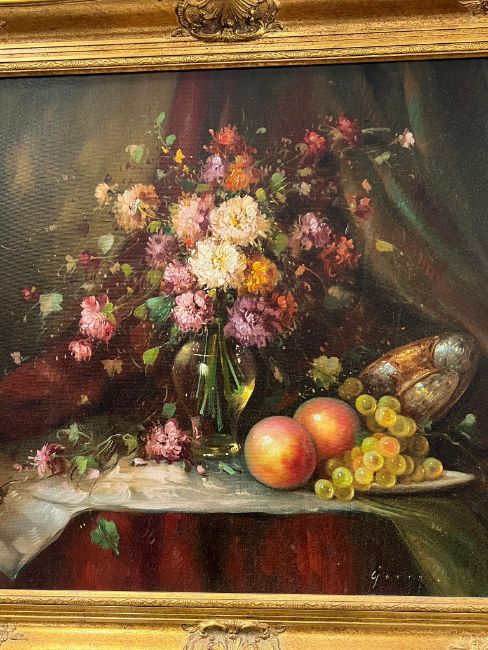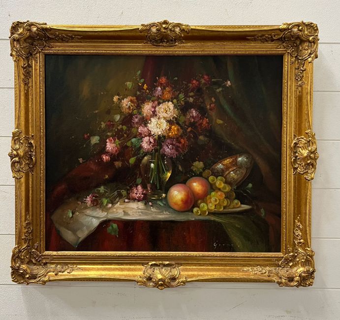 A contemporary still life of flowers in ornate frame, signed bottom right. Frame size 65 x 78 cm