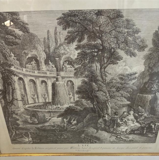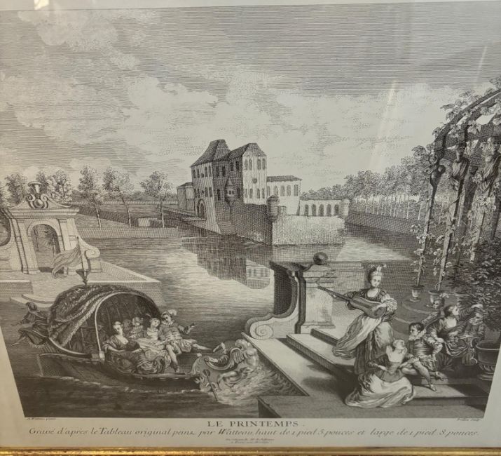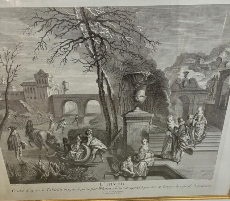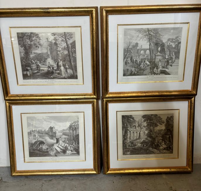 A set of four French lithograph depicting the four seasons (Frame size 70cm x 80cm)