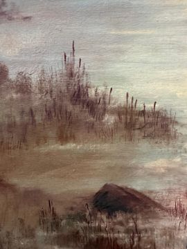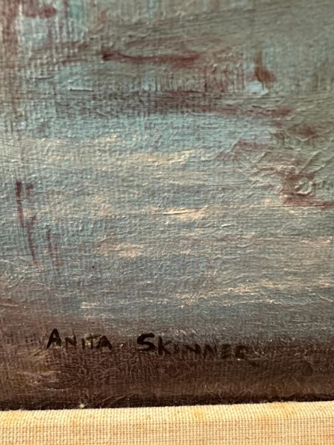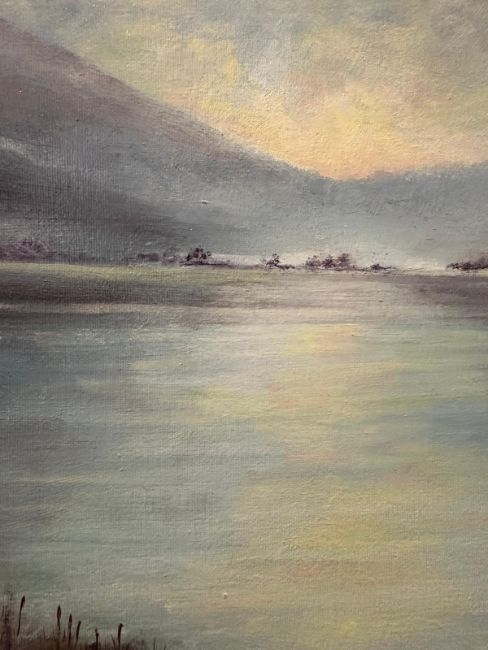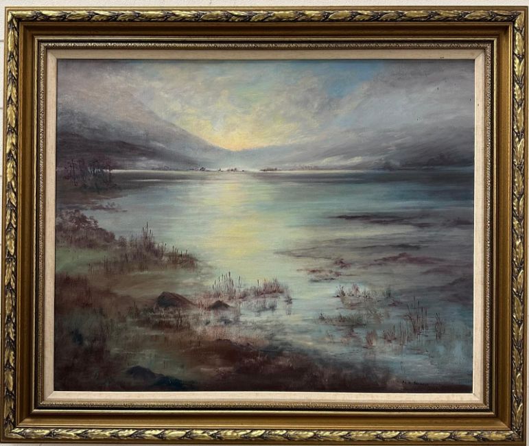 An oil on canvas of a lakeside scene at dusk by Anita Skinner 94cm x 77cm