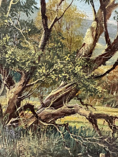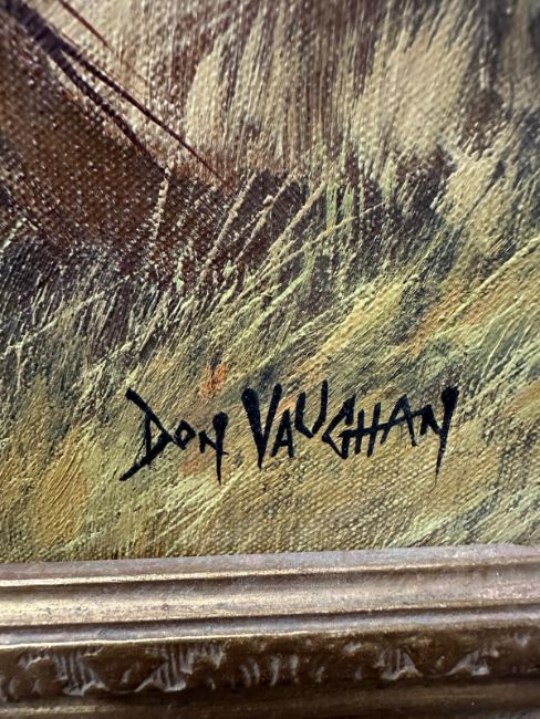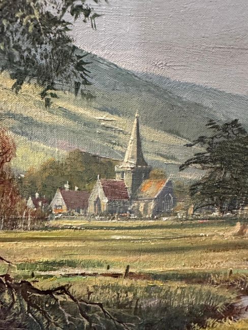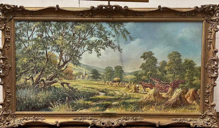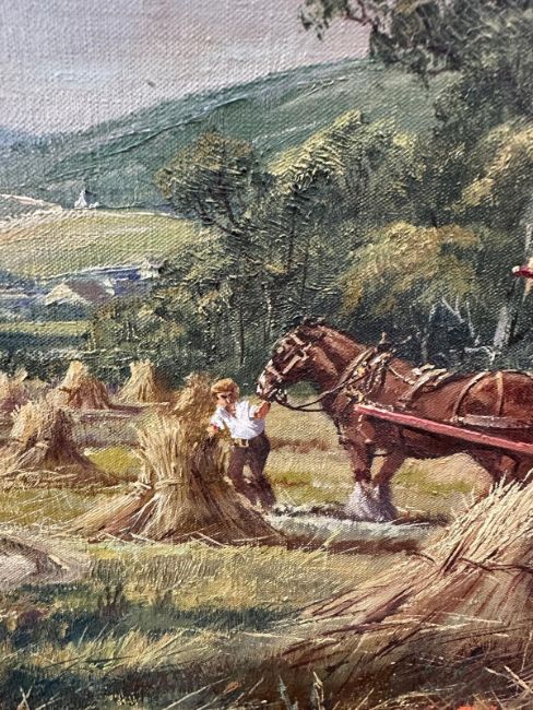 An oil on canvas of a farming scene titled "Welsh Harvest by Don Vaughan