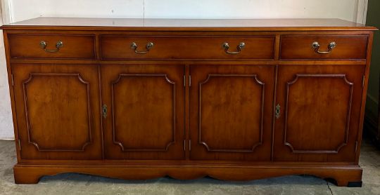 A mahogany veneer sideboard comprising of a cutlery drawer and two others over two, two door cupboards by Bradley (H77cm W165cm D42cm)