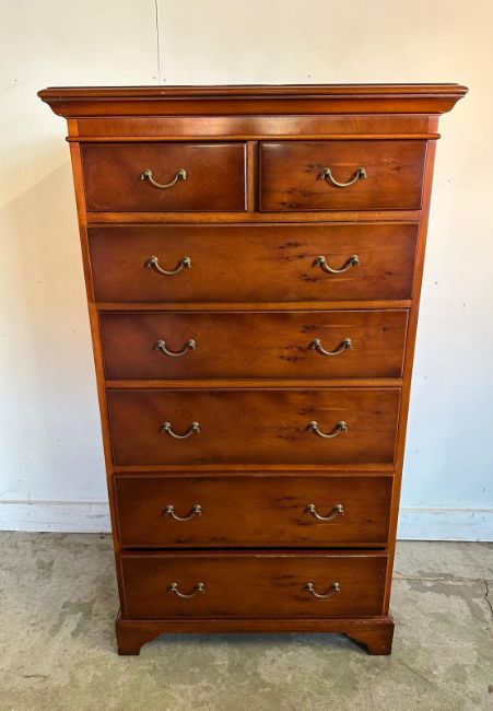 A mahogany veneered tall boy with two short drawers over five long (H133cm W76cm D49cm)