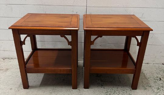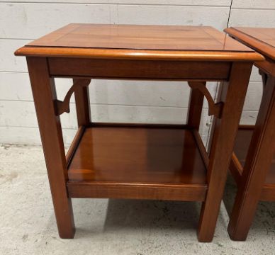 A pair of veneered side tables with shelf under and string inlay to tops (H56cm W49cm D41cm)