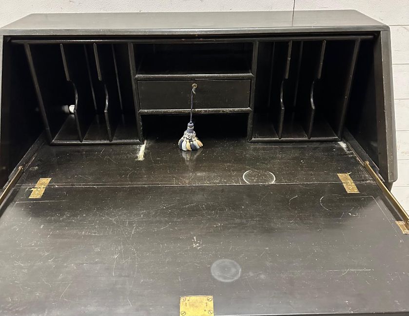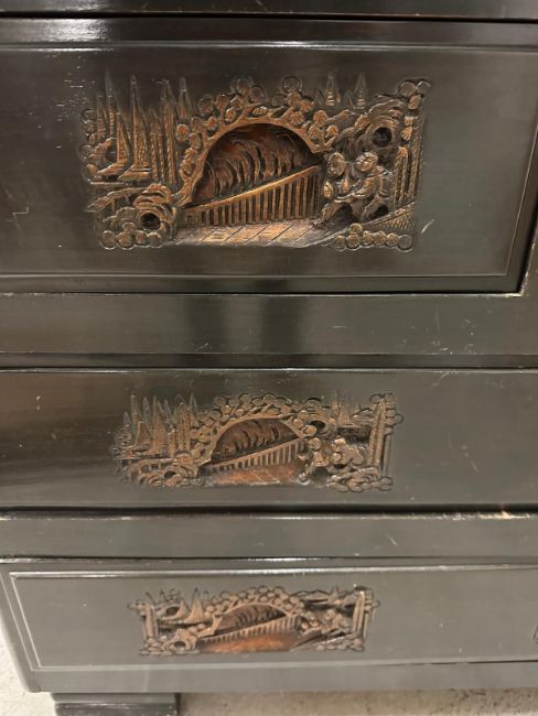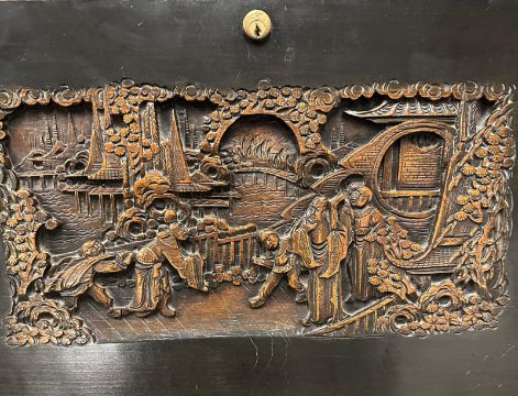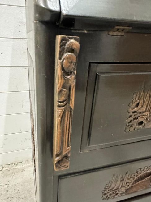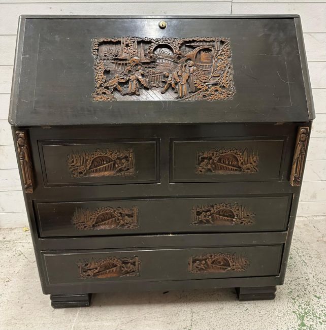 A Mid Century hardwood bureau, heavily carved with far Eastern scenes (H106cm W92cm D43cm)