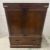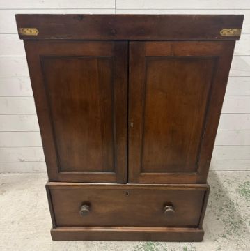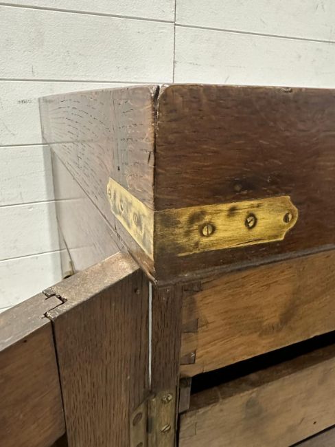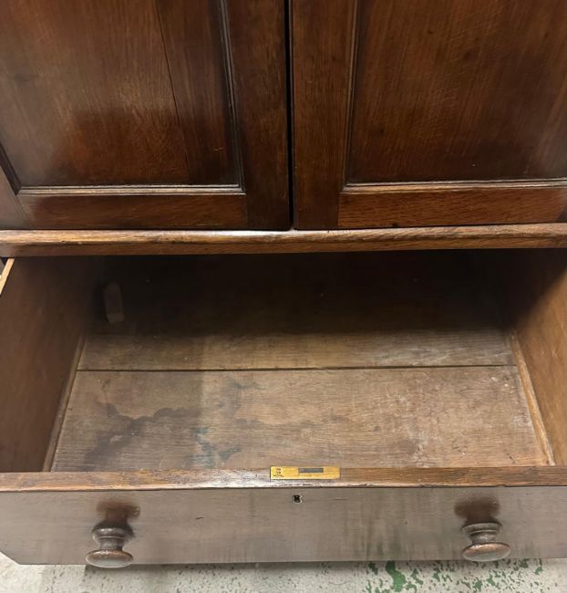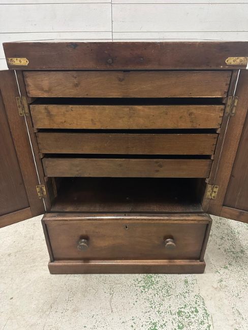 An oak two door linen cupboard in the campaign style with a mahogany veneer, the doors opening to four drawers with a long drawer under (H118cm W77cm D62cm)