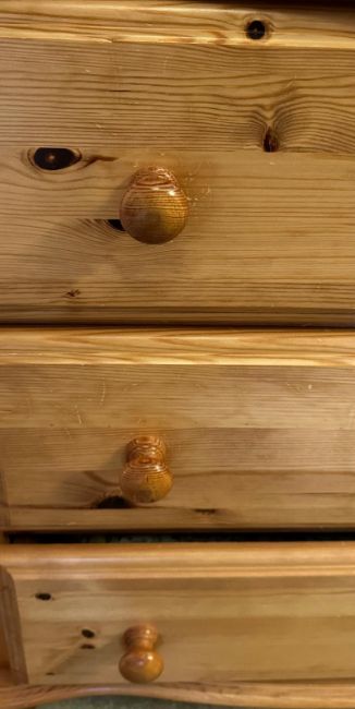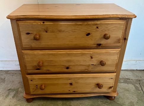 A pine three drawer chest of drawers on bun feet (H72cm W79cm D46cm)