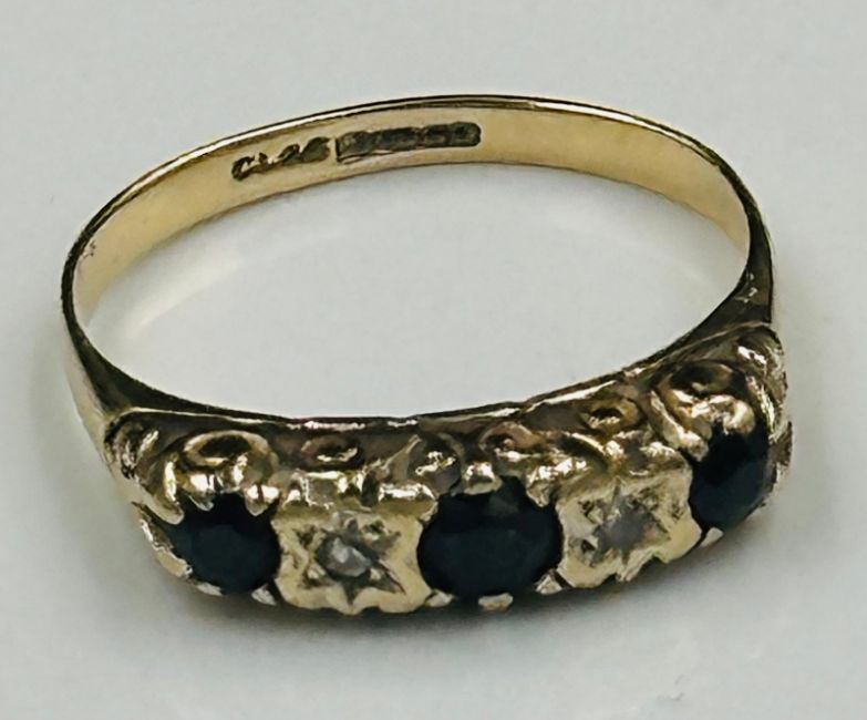 A 9ct gold sapphire and diamond ring, approximate size O and weight 2.1g