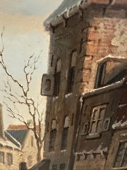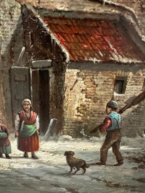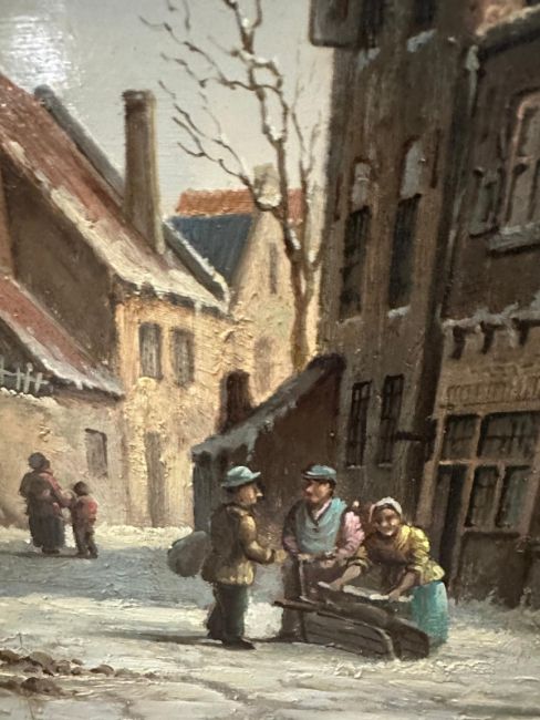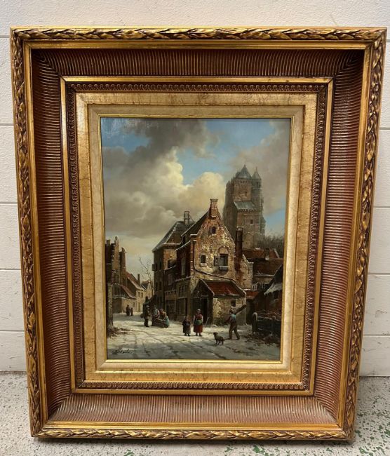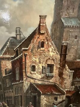 An European school oil on board of a 19th Century street scene signed lower left 54cm x 63cm