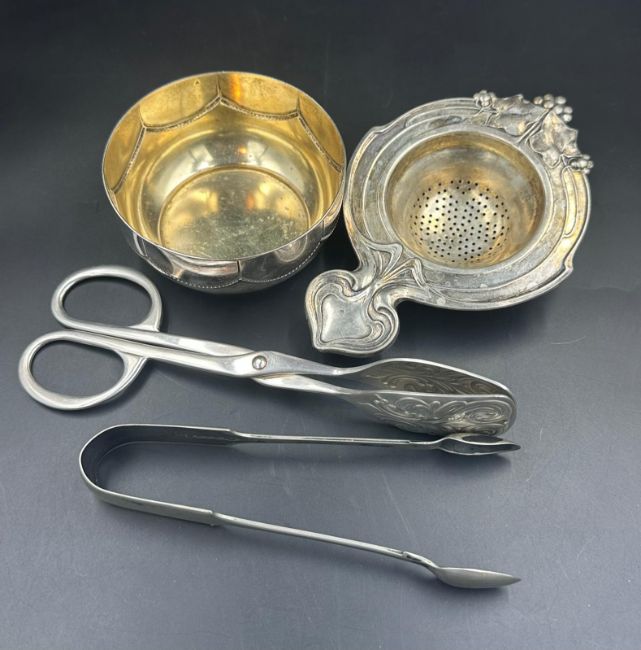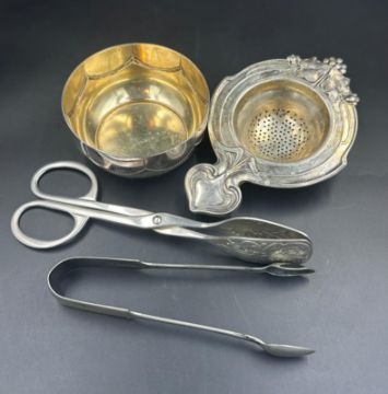 A selection of WMF items to include tea strainer, sugar bowl, cake serving tongs, sugar nips.
