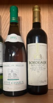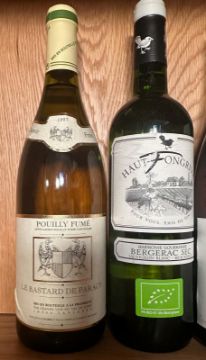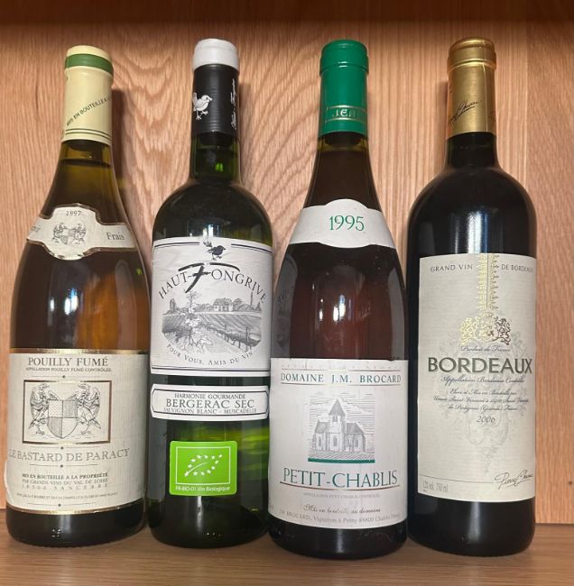 A bottle of 1997 Pouilly Fume, a bottle of Vevgeac Sec, a 1995 Petit Chablis and a 2006 Bordeaux Blanc