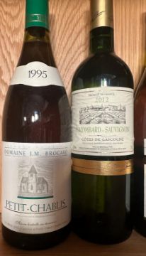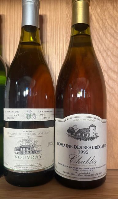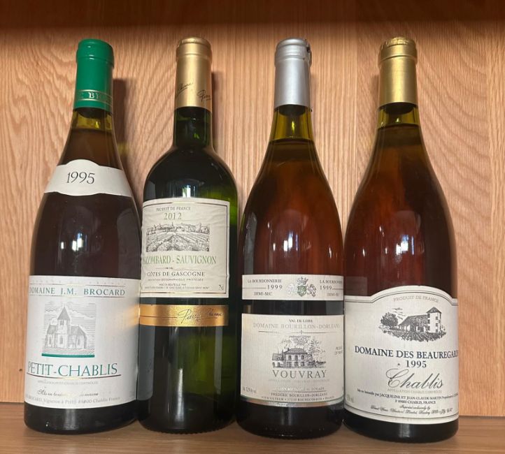 A bottle of Petit Chabis 1995, a Colombard Sauvignon 2012m a Vouvray 1999 and a Chablis 1995