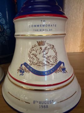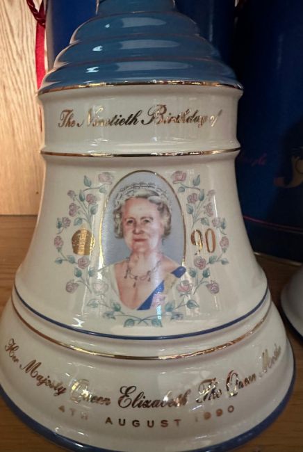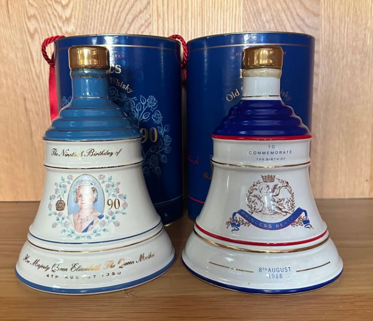 Two Bells whiskey bell shaped decanters with contents, one to commemorate the 90th birthday of HRH the Queen Mother and the other the birth of Princess Beatrice