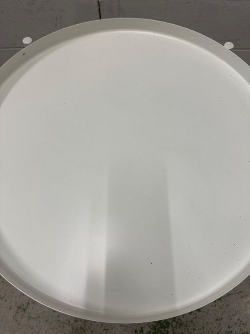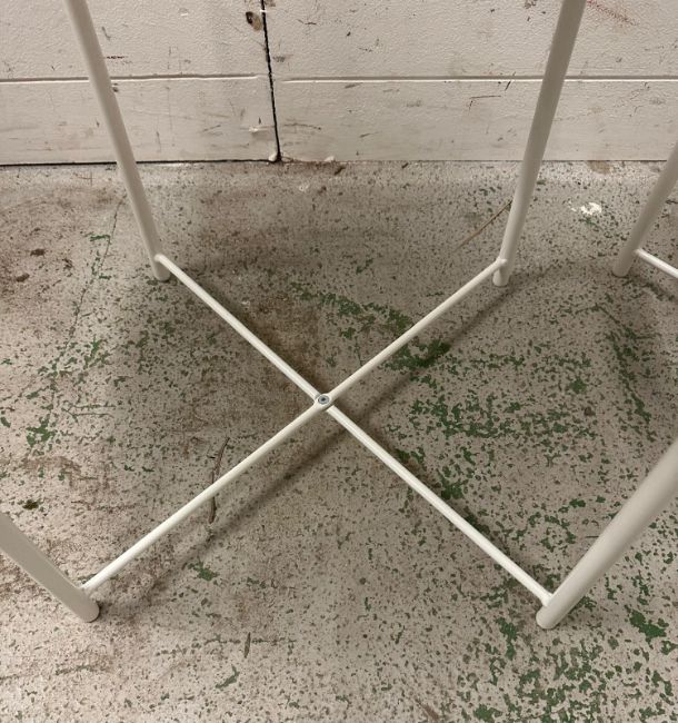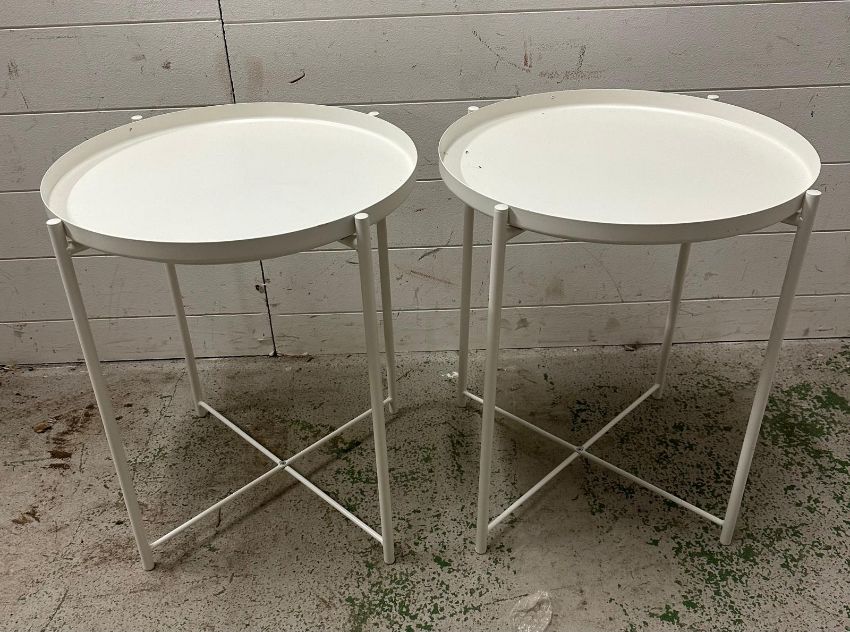 Two white metal circular side tables with detachable tops (H53cm Dia44cm)