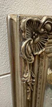 A silver painted bevel edged hall mirror with floral detail 41cm x 132cm
