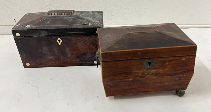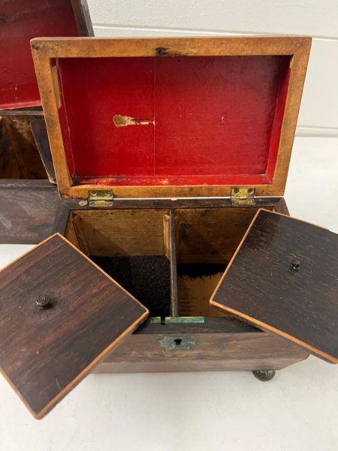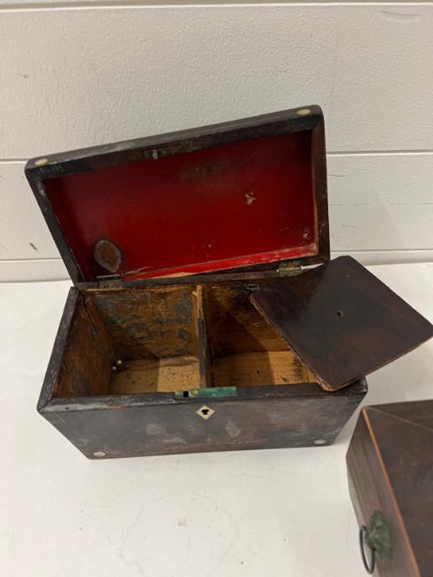 Three wooden boxes, two Sarcophagus tea caddy's and a work box AF