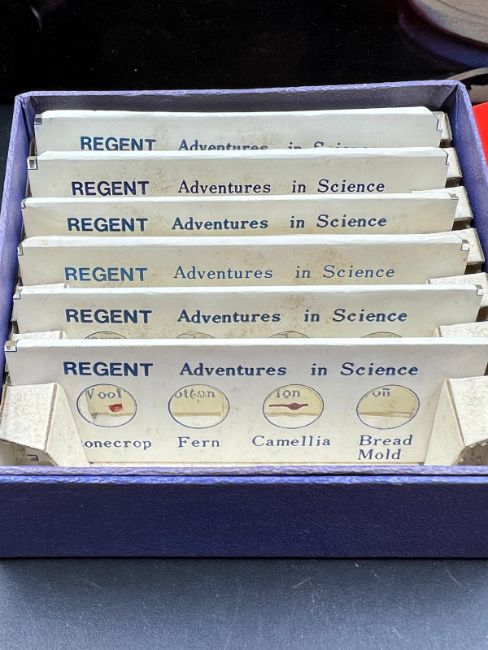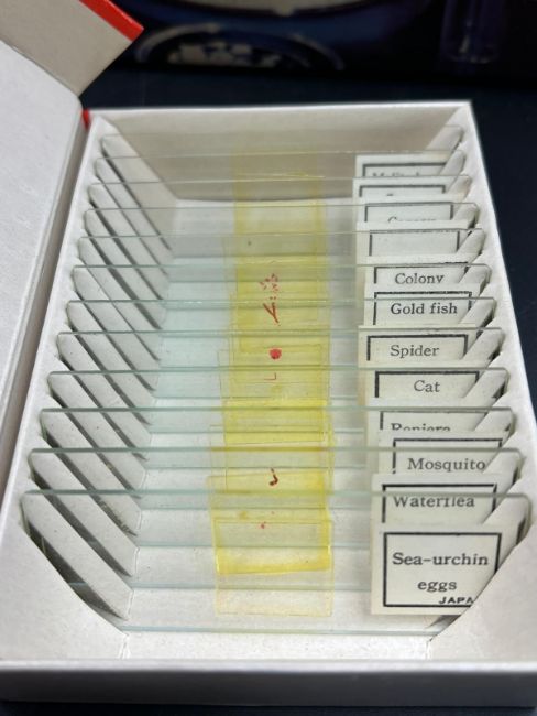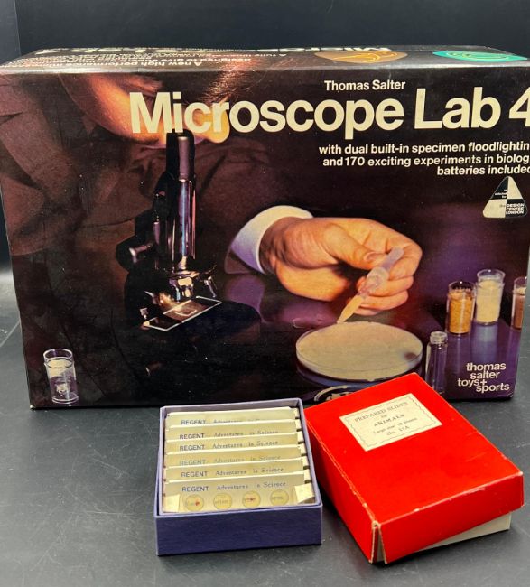 A Thomas Salter Microscope Lab $ along with several boxes of slides, including prepared slides of animals No 11A.