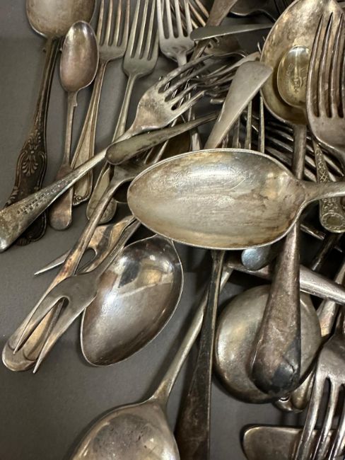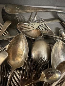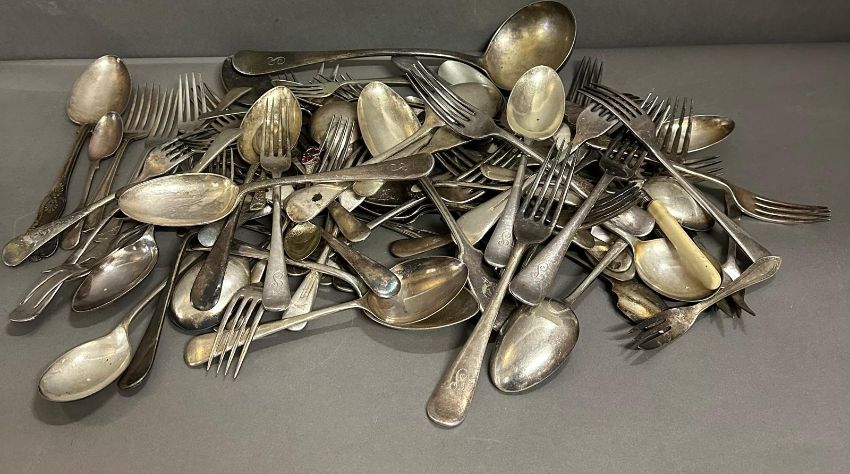A quantity of silver plate and white metal flatware to include spoons, forks and a ladel