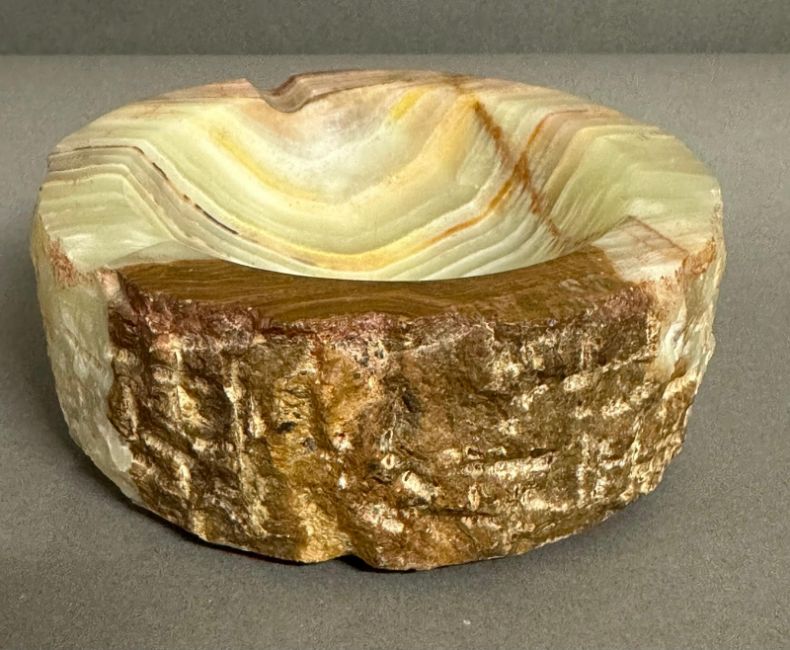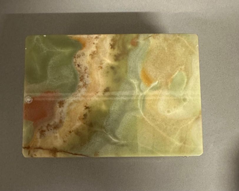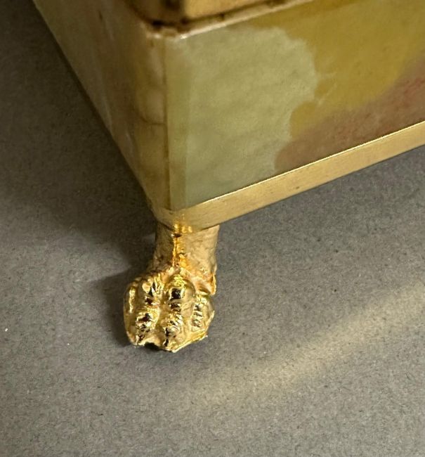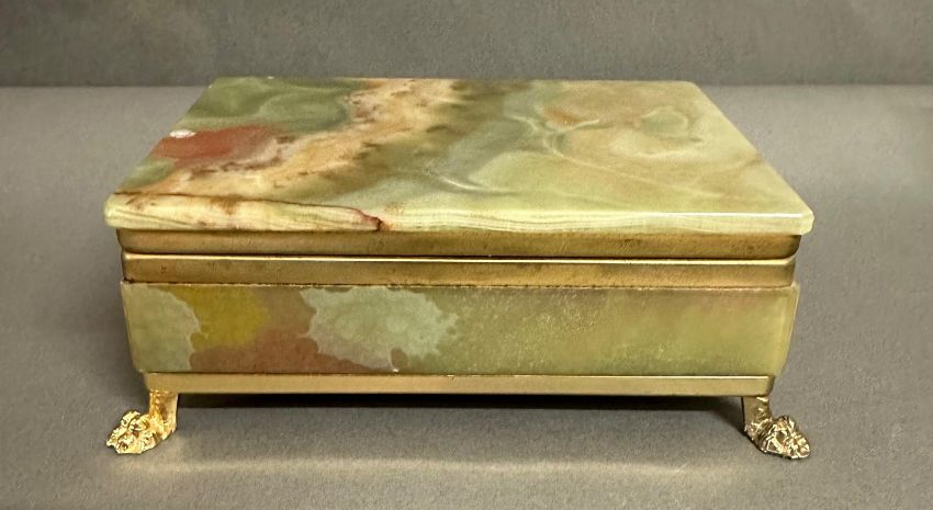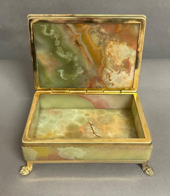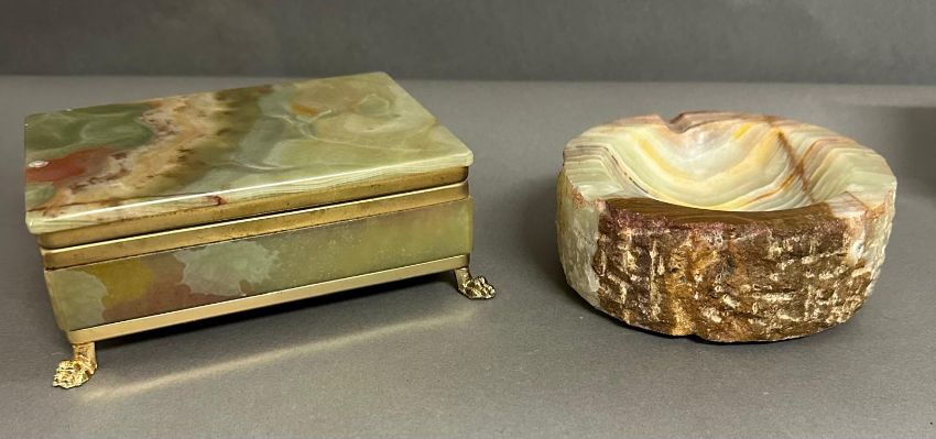 An onyx cigarette box on brass lion paw feet and an onyx ash tray