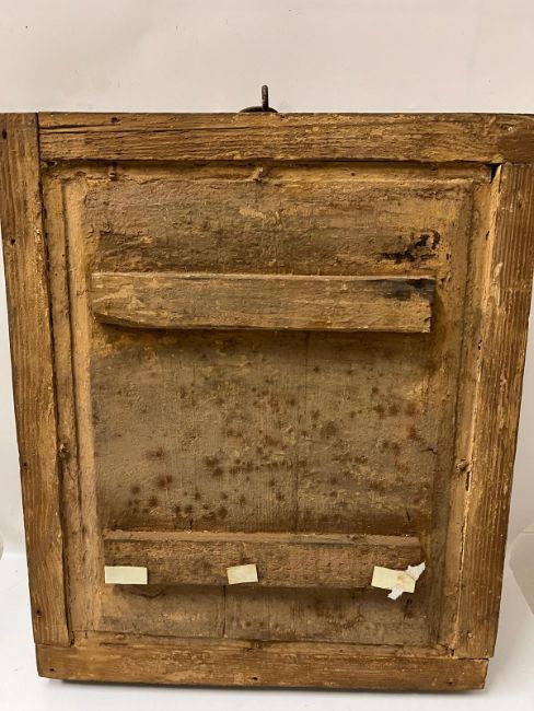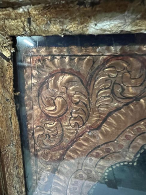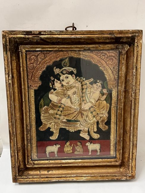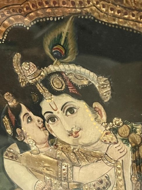 An Indian painted and relief panel depicting Krishna with attendants under an ornate arch,