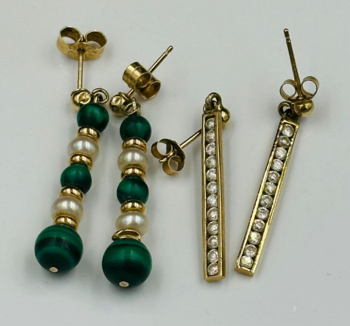 Two pairs of 9ct gold earrings including one jade set