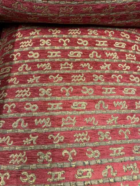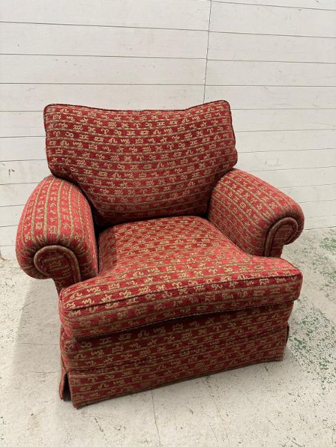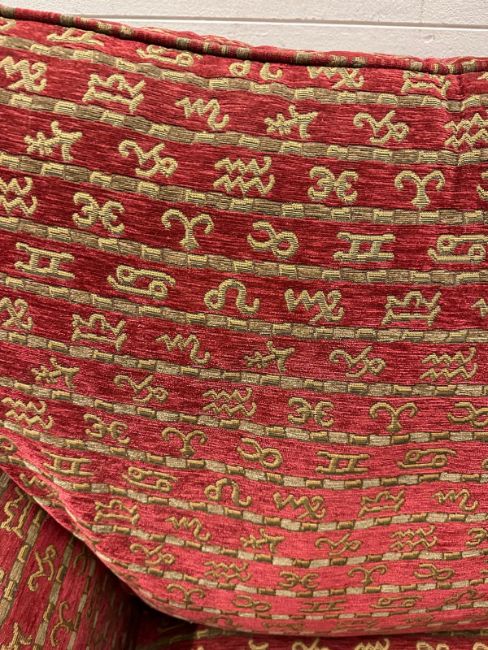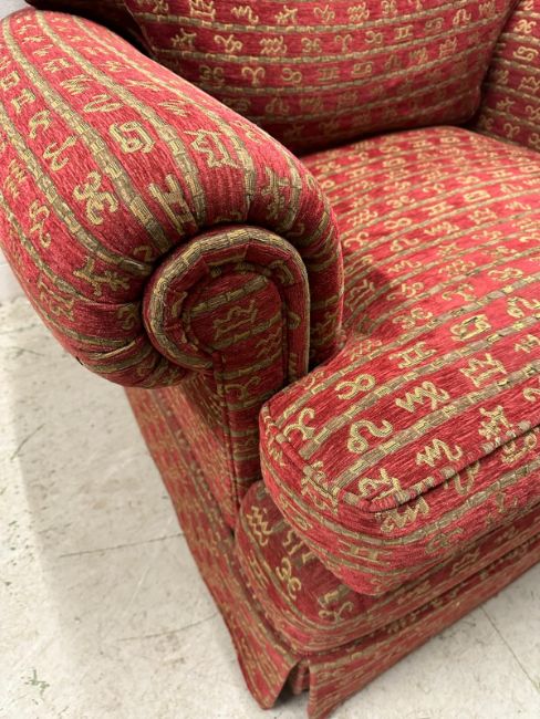 A Duresta single armchair upholstered in a red and gold hieroglyphic pattern
