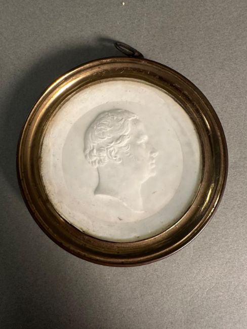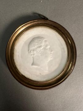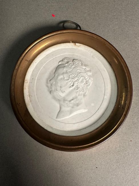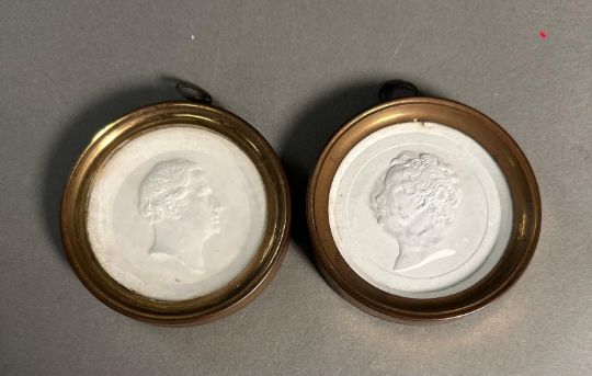 A pair of framed plaster portrait medallions.
