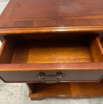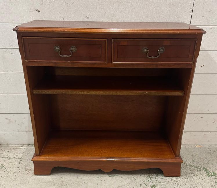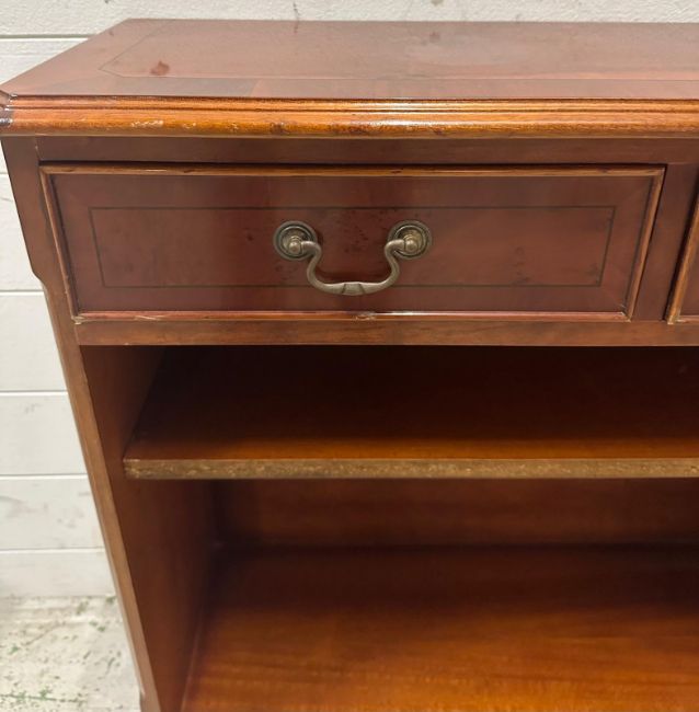 A yew veneered dwarf open library bookcase with two short drawers over (H75cm W77cm D27cm)