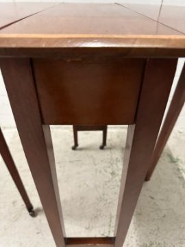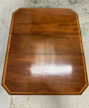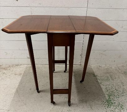 A mahogany drop leaf gate legged side table with string inlay (H67cm W76cm D61cm)