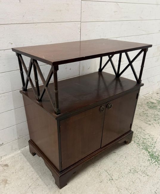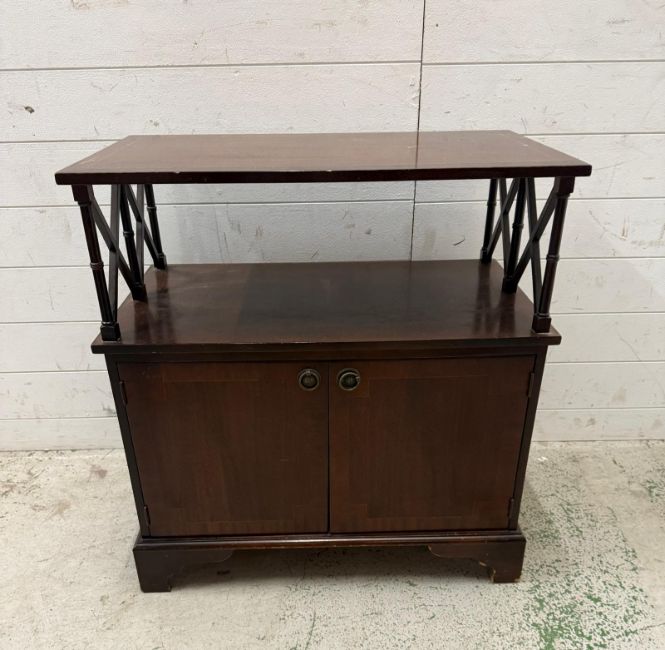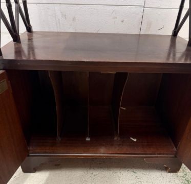 A mahogany two door music cabinet with shelf over (H76cm W70cm D40cm)