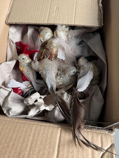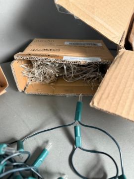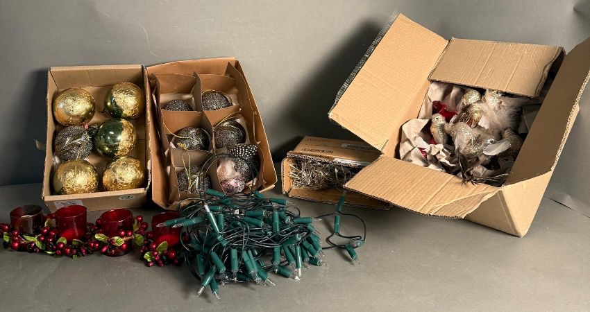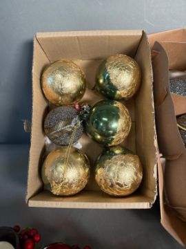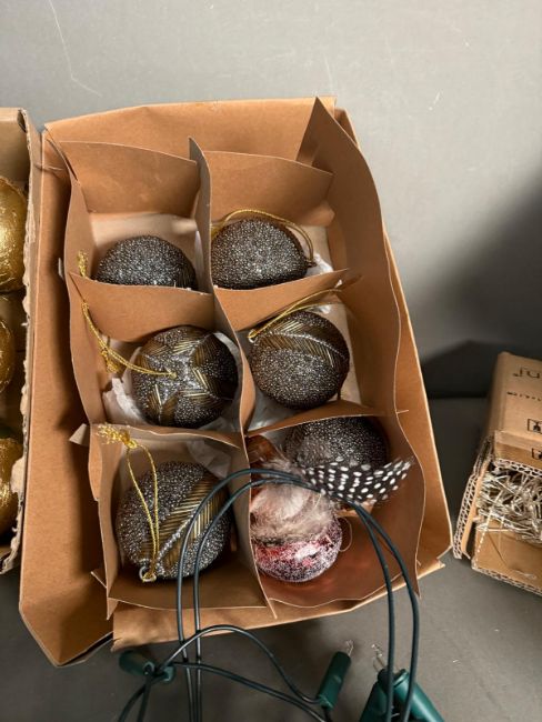 A selection of Christmas decorations to include baubles and fairy lights