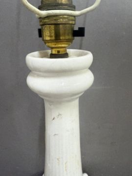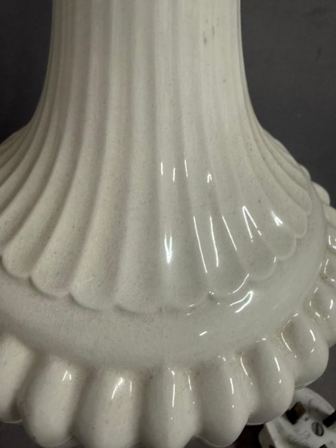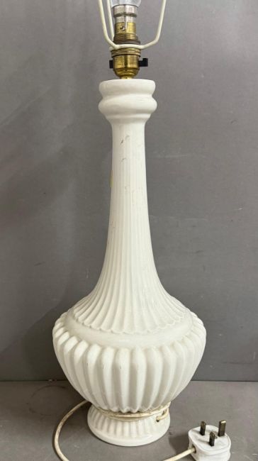 A white ceramic ribbed table lamp