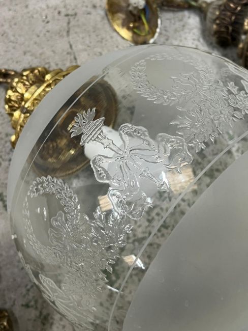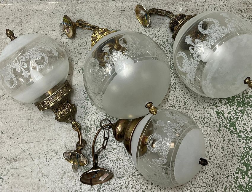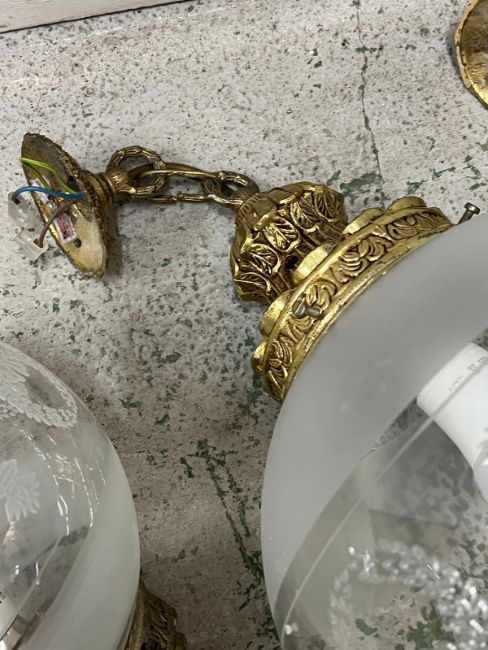 Two medium gilt and glass metal globe ceiling light along with two smaller ones (Approx H47cm)