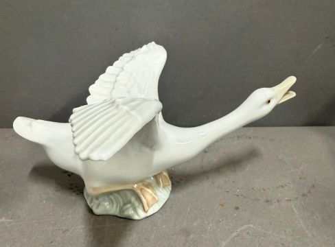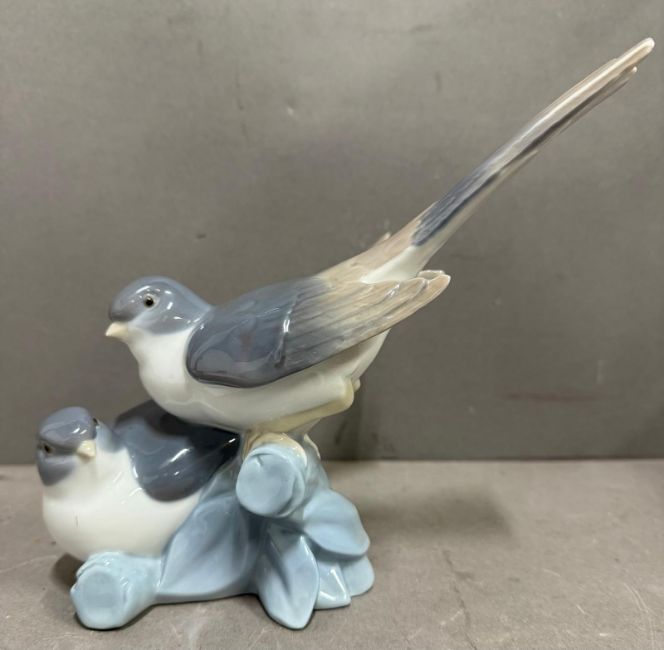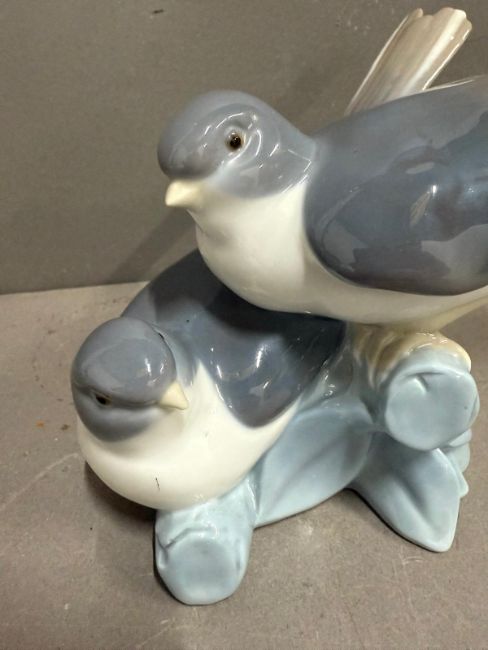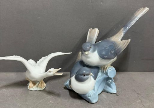 Two Lladro figures: Two Lovebird figures on a branch and a swan.