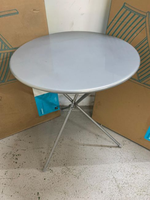 A silver metal circular garden table and two boxed Sorrento garden armchairs