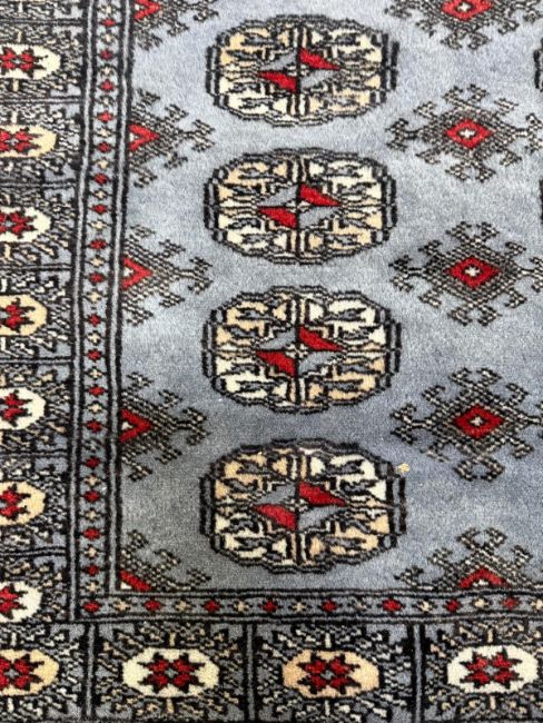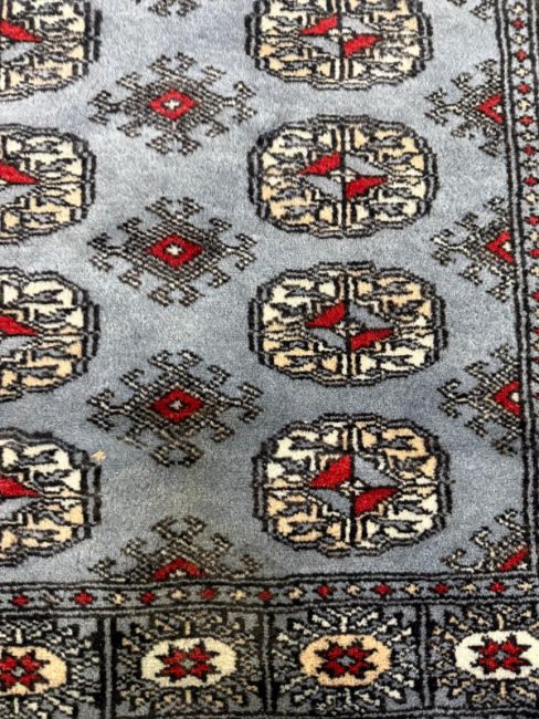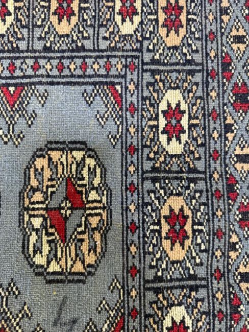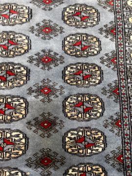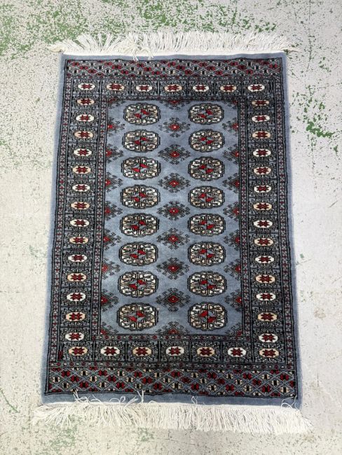 A wool prayer mat. Blue grounds with geometric border. 125x78cm